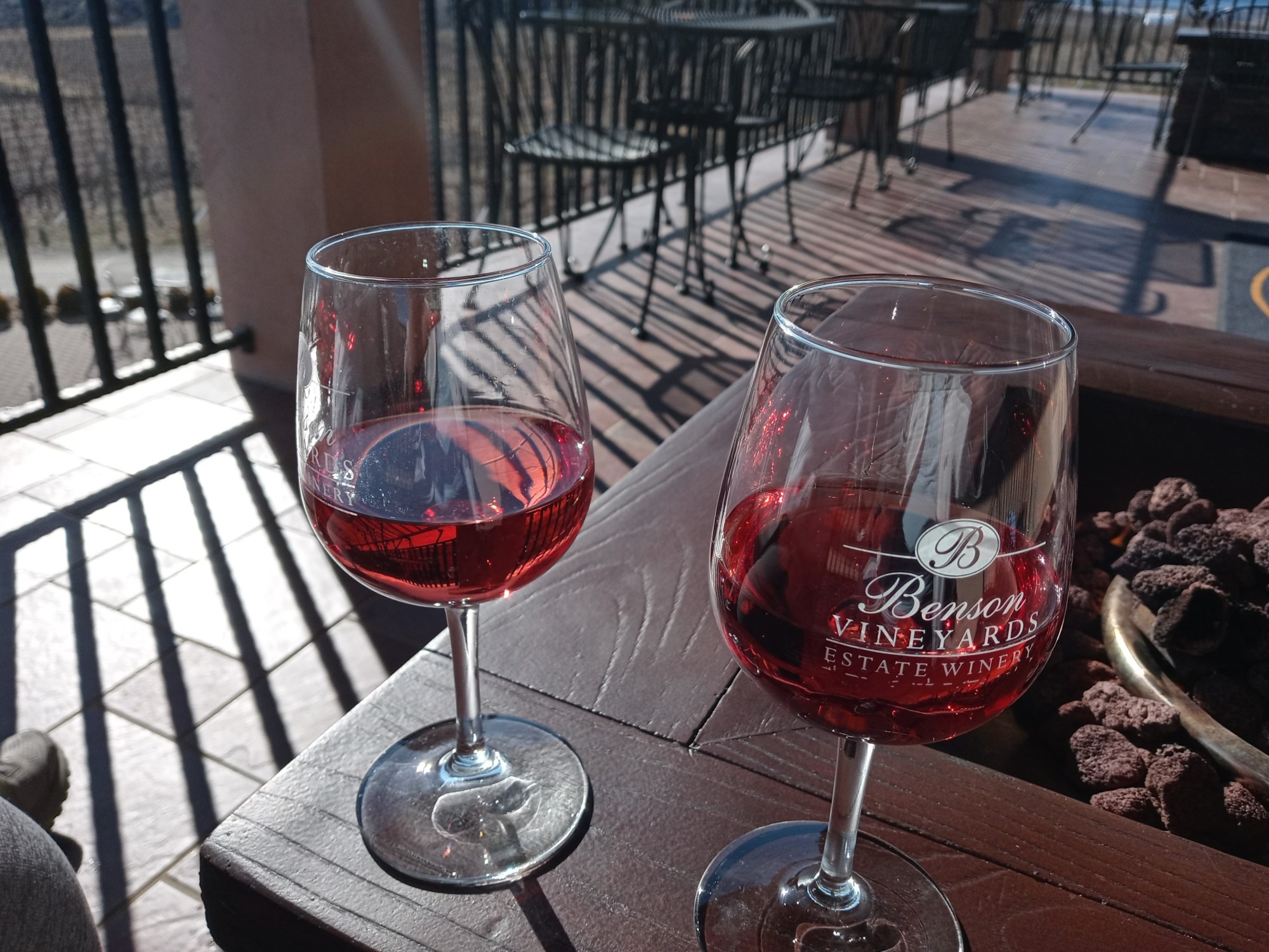 Our first visit to Benson Vineyards Estate Winery happened in early March 2021, when the vines were brown, and the crystal-clear view of Lake Chelan was framed with snow-capped mountains.  In the relaxing setting, there were hints of new growth dotting the beautiful landscape.  The air was brisk and breezy on the deck overlooking the vineyard, so Jake and I quickly claimed the outdoor fire pit to accompany our bottle of wine.  On a coworker’s recommendation, we requested a tap-filled bottle of Benny Bubbles.